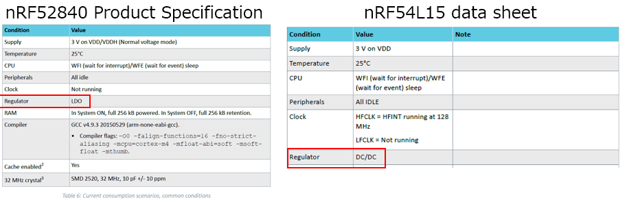 データシートの”Current consumption”(消費電流)の項の条件も、nRF52シリーズでは基本LDOでの値が記載されており、DC/DCの場合は項目ごとに条件に追記されていましたが、nRF54LシリーズではDC/DCの値のみ記載されている点ご注意ください。