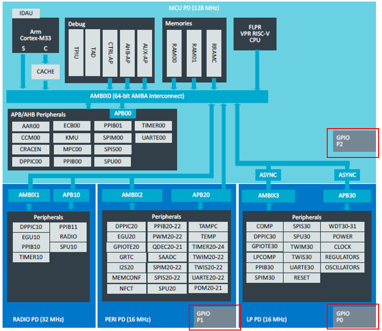 このように、nRF54Lシリーズでは、3つのパワードメイン(MCU、PERI、LP)にそれぞれ専用のGPIOポート(P2, P1, P0)が割り当てられており、それぞれ異なる特性を持っています。