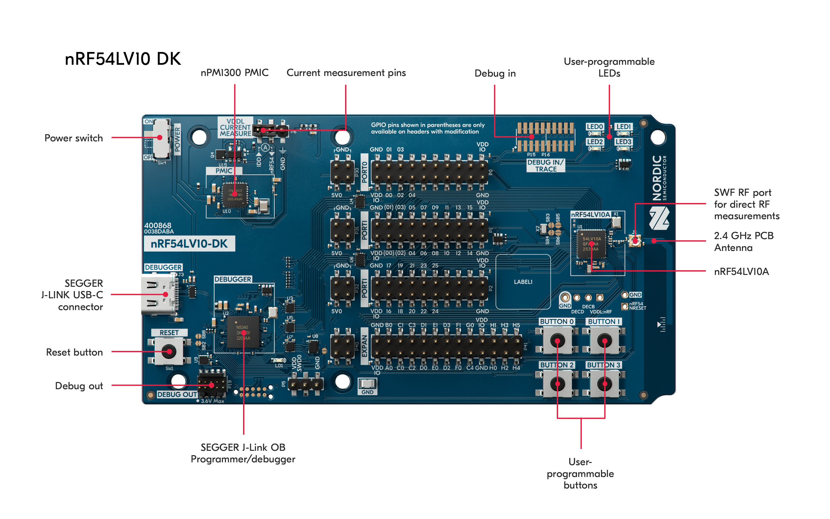 合わせてリリースされるnRF54LV10 DK(Development kit)は、手頃な価格でnRF54LV10Aを使用した開発に必要な機能を1枚のボードに搭載しています。
